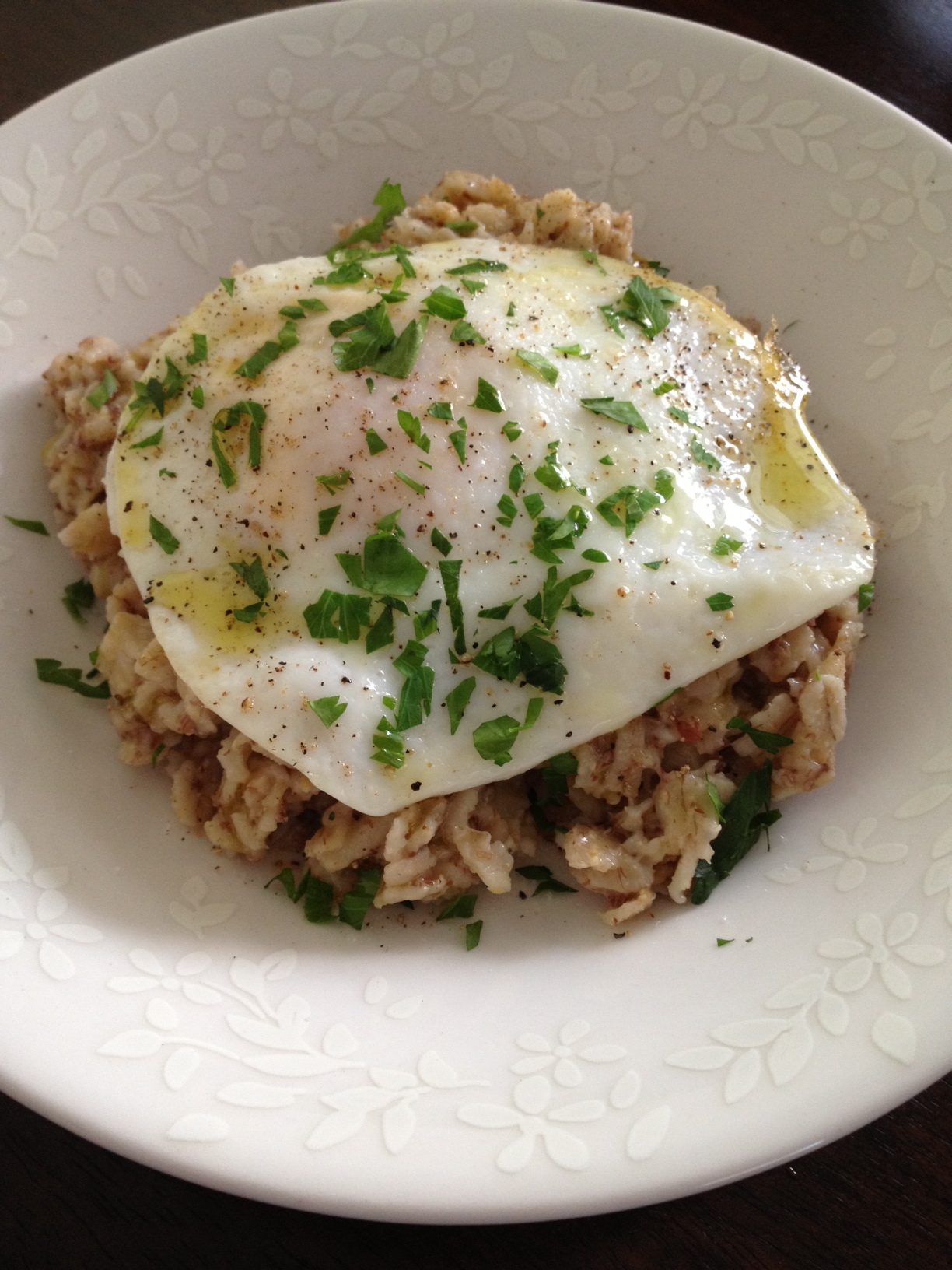 It was quite delicious! I loved how the runny yoke mixed with the oats and the olive oil. The next time I have it in the house, I will have to try adding shaved Parmigiano cheese. I think it would compliment this meal well.