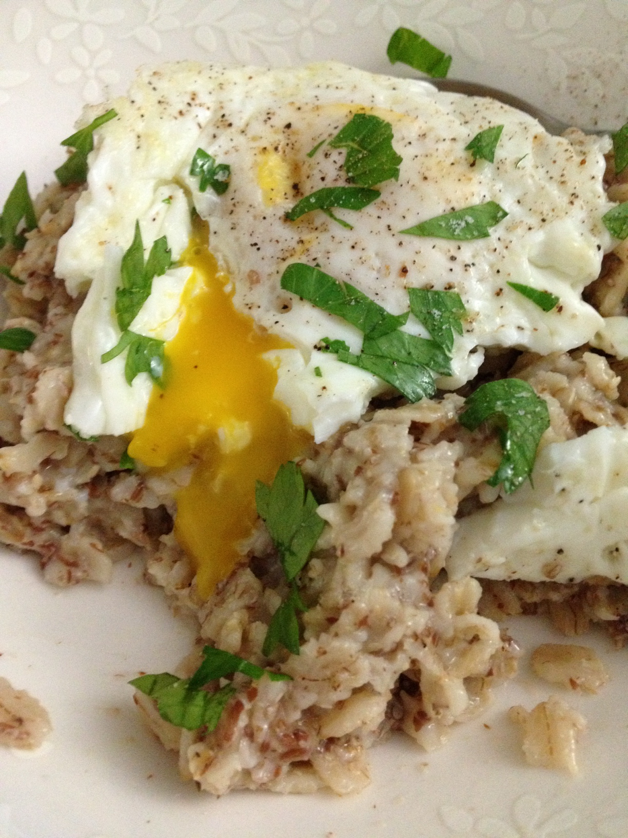 I cooked the oatmeal and added in a tablespoon of flax meal (gotta get in my omega-3’s). Then cooked an egg over easy in extra virgin olive and placed it over the oatmeal. Whatever olive oil was left in the pan I drizzled on top. Finally, I sprinkled on some sea salt, cracked fresh black pepper and chopped parsley.