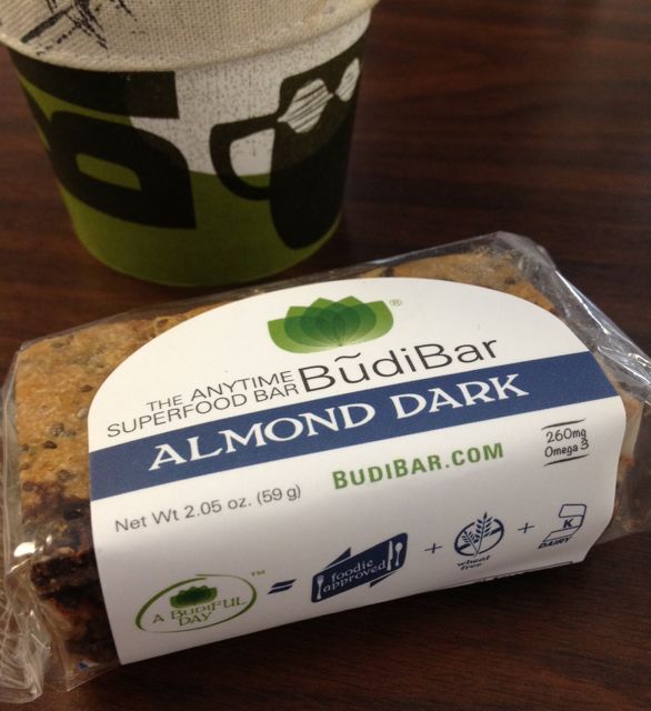 One morning I was at Whole Foods getting a coffee, and noticed a bowl filled with assorted little bars by the register. They were called BudiBar, The Anytime Superfood Bar. I picked up the Dark Chocolate Almond and read the label: Wheat, soy, and dairy free, all natural ingredients, and Foodie Approved. I am always looking for a healthy mid-afternoon snack for that 3:00pm slump. You know, that time when us 9-5er’s are counting down the last 2 hours of work without falling asleep at our desks. Instead of reaching for a chocolate or candy later on, I decided to purchase the BudiBar.