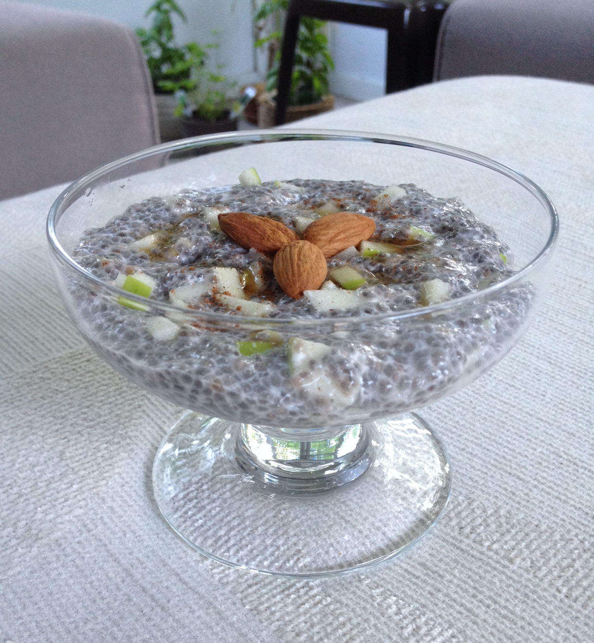 “Autumn Apple” – add 1/4 tsp of apple pie spice and 1/2 tsp maple syrup (grade B) with the milk before refrigerating. Mixed in diced granny smith apple, topped with almonds (or walnuts) and cinnamon.