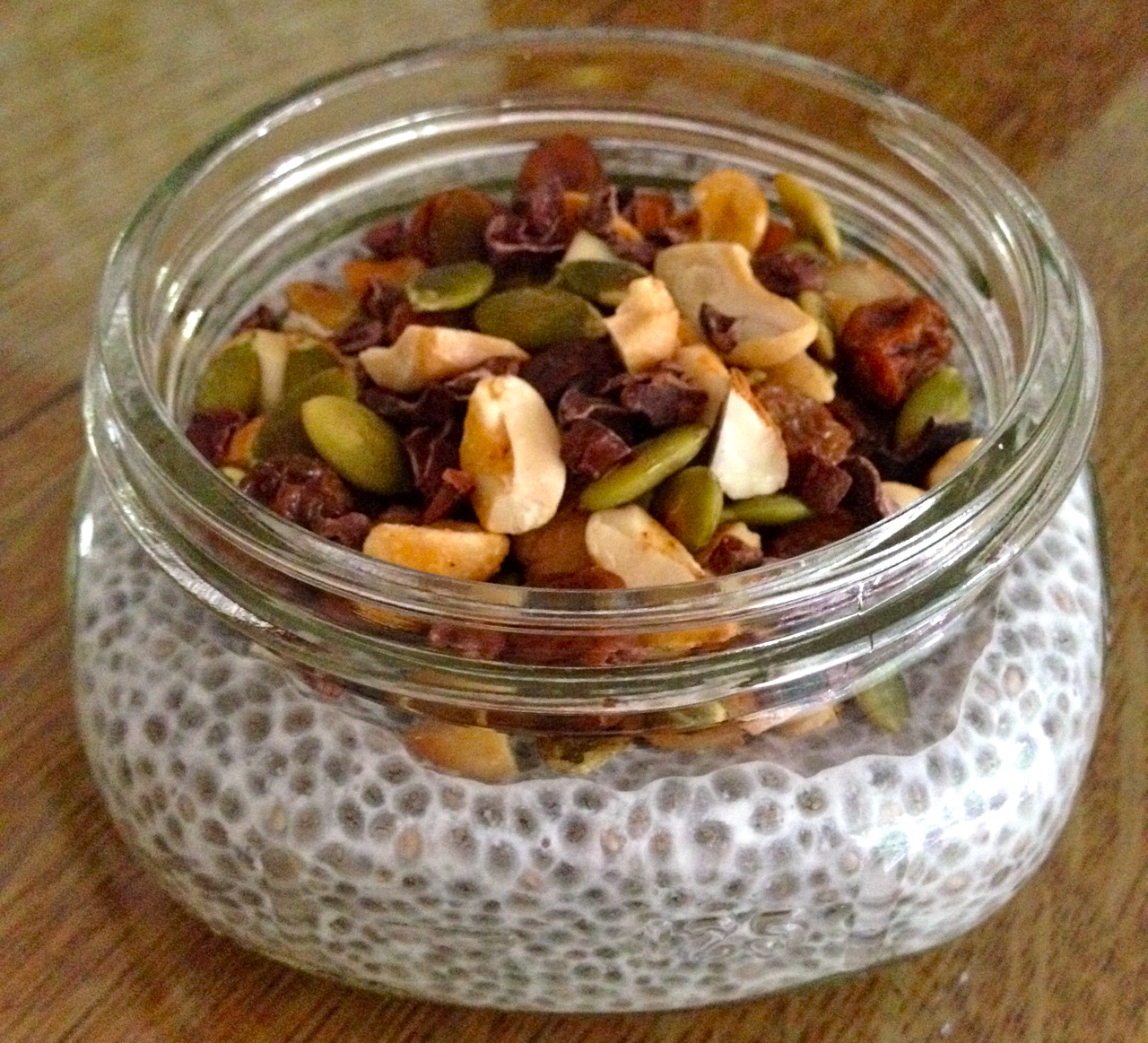 Add chia seeds to small bowl or container with a lid. Stir in milk, cover and refrigerate for about 30 minutes. Stir again and refrigerate overnight. Once it’s set, add any toppings you want.