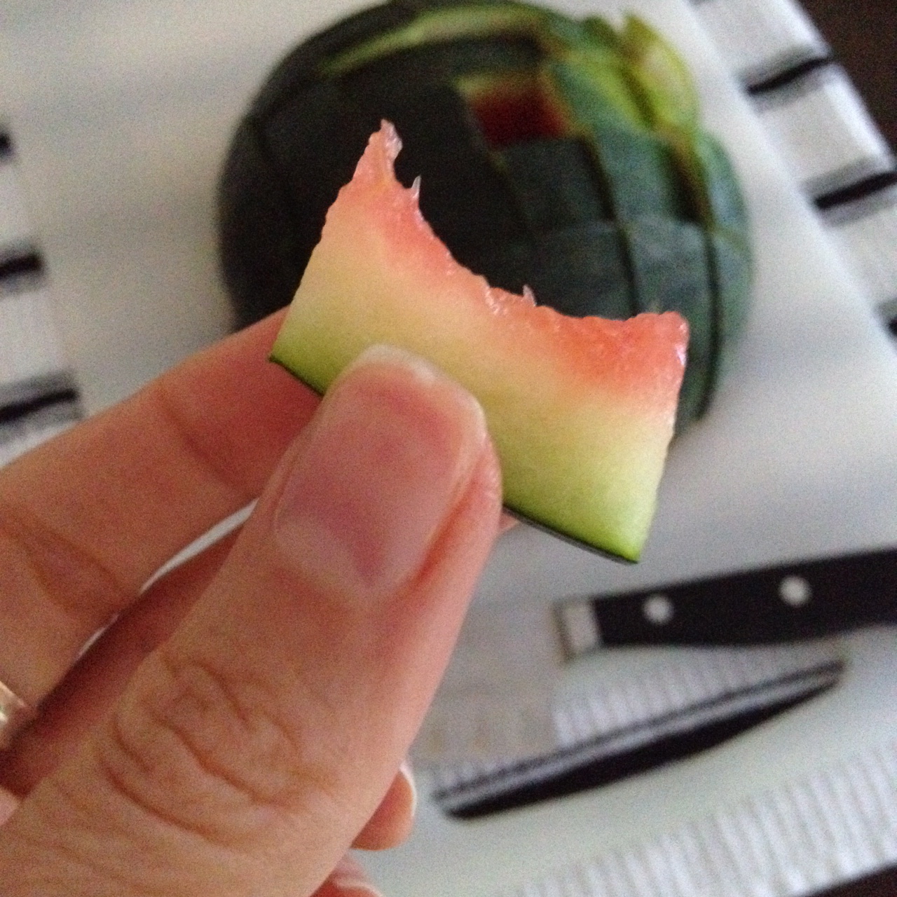Who knew there was an easier way to go about cutting a watermelon to share? I came across this method online, and since I got a beautiful Sugar Baby in the CSA basket this weekend, I’m sharing this technique with you.