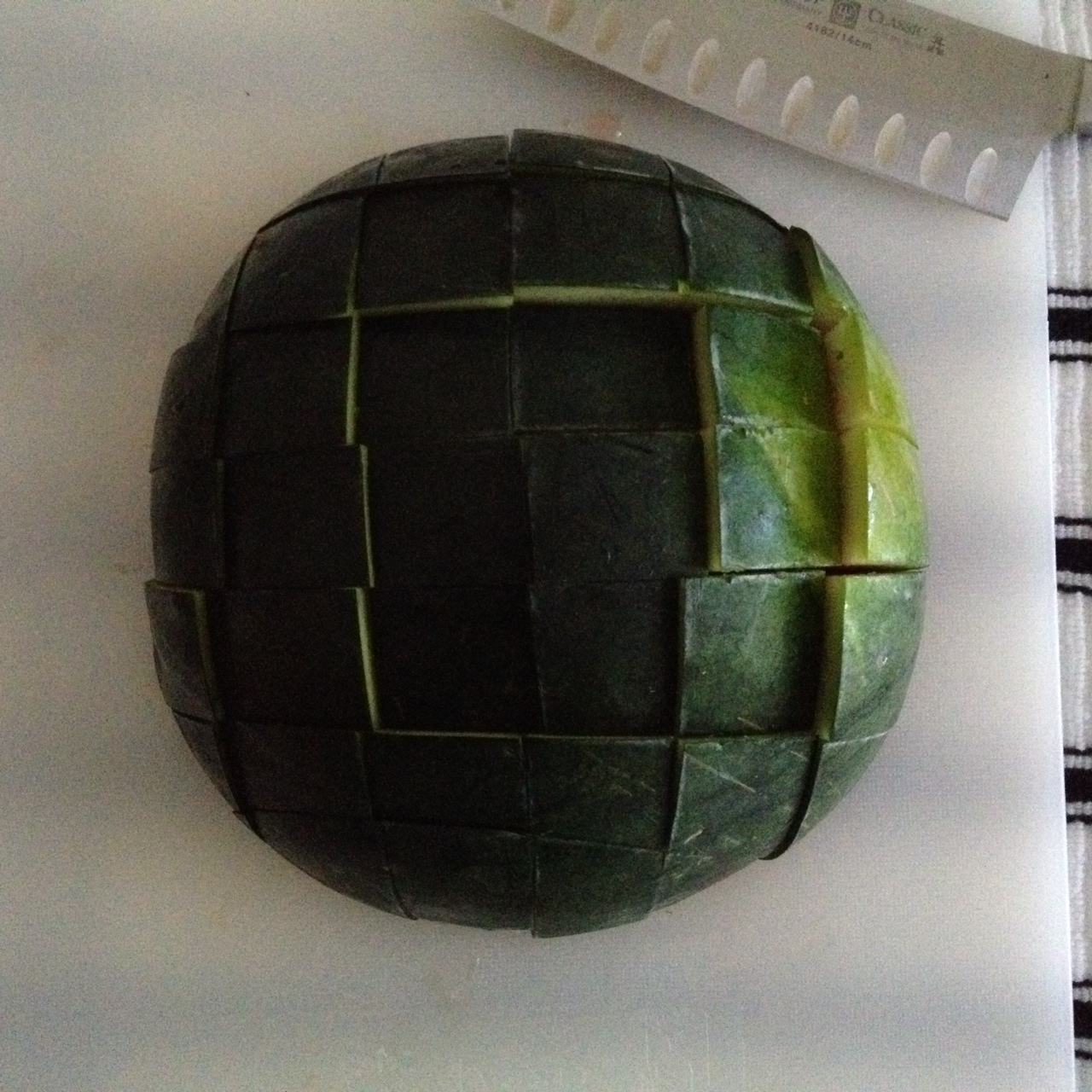 3. Rotate the cutting board and cut 1 to 1-1/2 inch slices the other direction, keeping the watermelon in tact.
