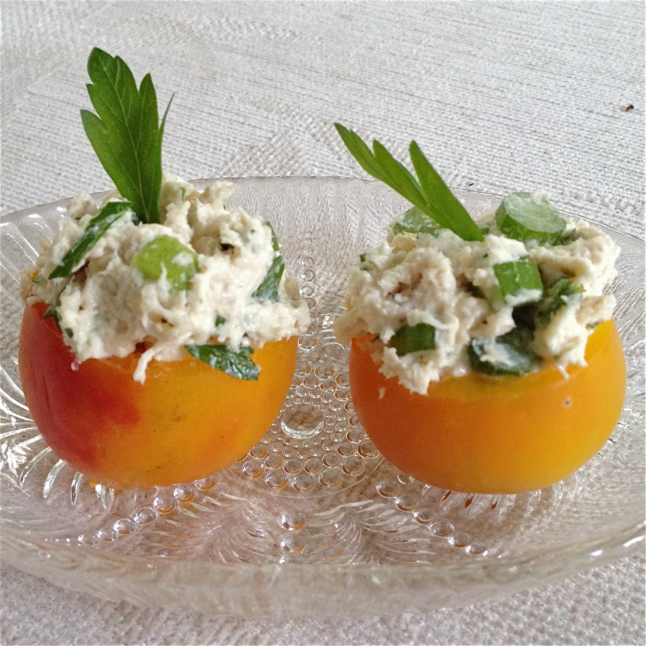Hey everyone! Summer feels like it’s right around the corner with all this beautiful weather we’re having. In just a few short weeks I’ll be picking up my weekly CSA filled with fresh produce and goodies. Soon tomatoes will be flooding my kitchen counter tops. While most of those tomatoes will end up getting jarred for sauce, the rest will get eaten ASAP. I personally love heirloom tomatoes and their variety of sweetness. They’re lovely on their own with a little salt and pepper, or in today’s case, stuffed with homemade chicken salad.