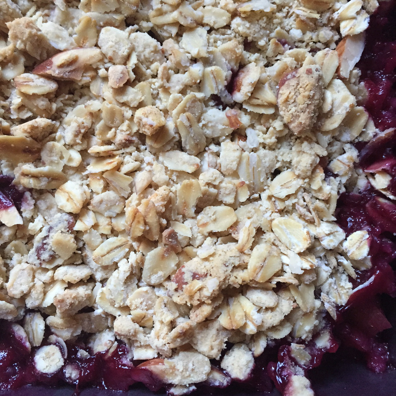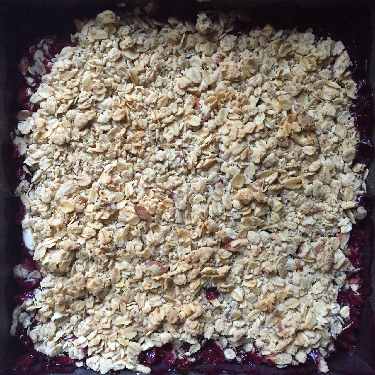 In another medium bowl, combine the oats, flour, almonds, and 1 tsp of Stevia. Stir in the melted coconut oil till it’s well incorporated. Sprinkle over the fruit mixture.