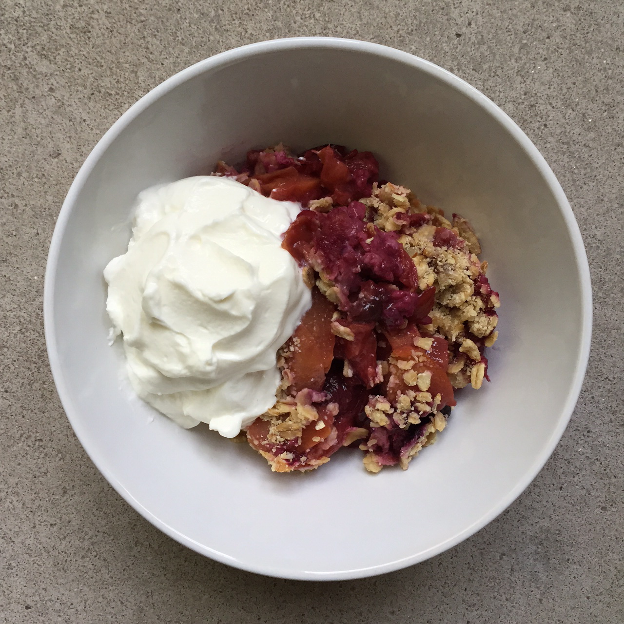 Let the crumble cool completely before refrigerating. As it sits the oats soak up a lot of the fruit juices and become soft. Pretty much like overnight oats. Scoop into a bowl, microwave about 40 seconds, and serve with whole plain Greek yogurt.