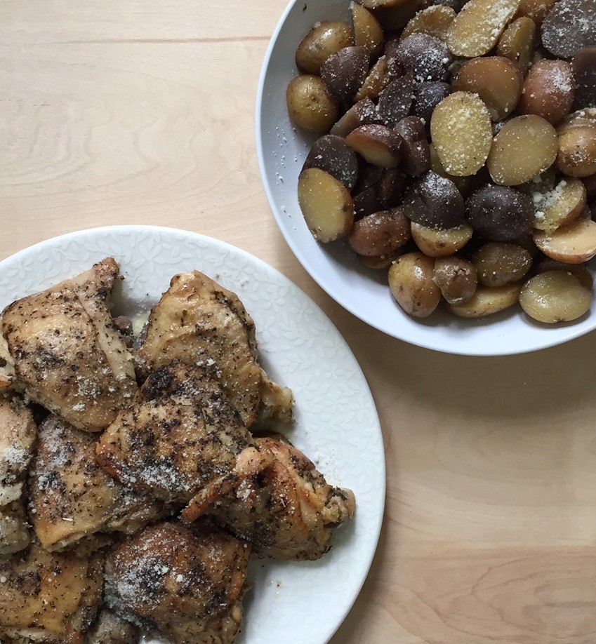 Seriously, when thyme is combined with potatoes it turns into a flavor marriage made in heaven. One of the tastiest combos ever! This entire meal is well-seasoned and so jam-packed with herbaceous flavors. The chicken falls off the bone and the potatoes come out perfectly tender. Adding the Parmesan cheese at the end fully completes the dish.