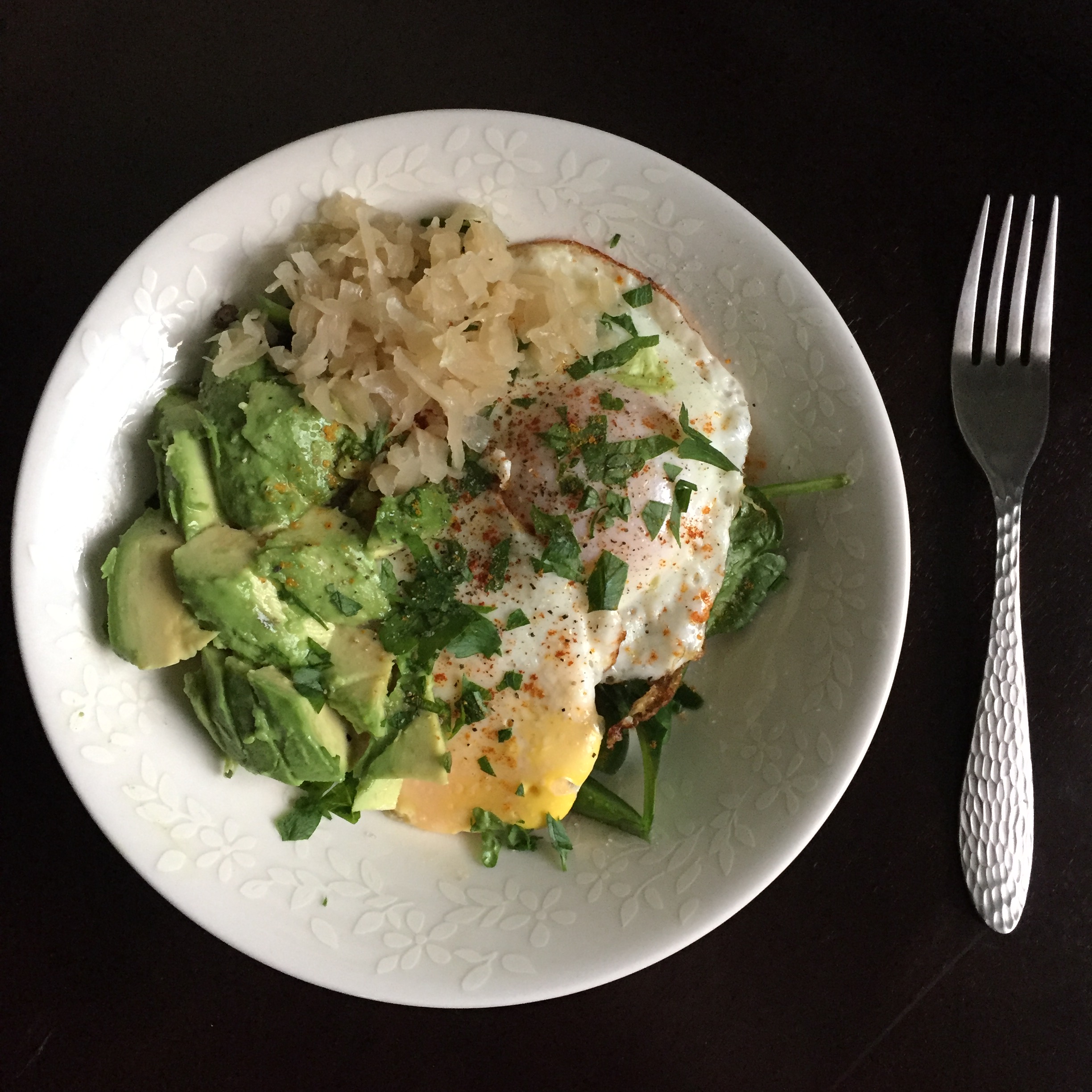 Heat the other teaspoon of bacon grease in the pan and add 2 eggs. Cover and cook until whites are set and yolk is still runny (or cooked however you prefer). Place on top of peppers and spinach. Season with salt and pepper.