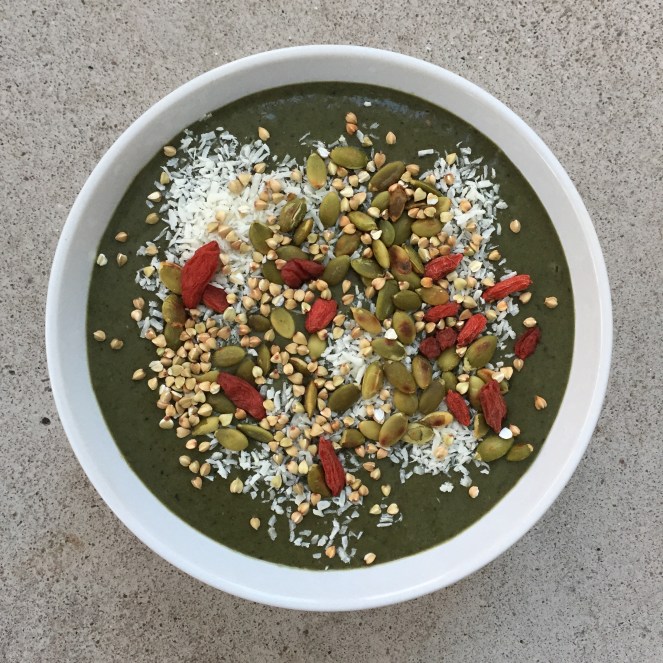 Topping a smoothie bowl might be the best part. Some of my favorite toppings are shredded coconut, chia seeds, nuts, toasted pumpkin seeds, and buckwheat groats. I like the way crunchy toppings combine with the creaminess of the smoothie. It adds a really nice texture, and I’m all for foods that incorporate multiple senses.