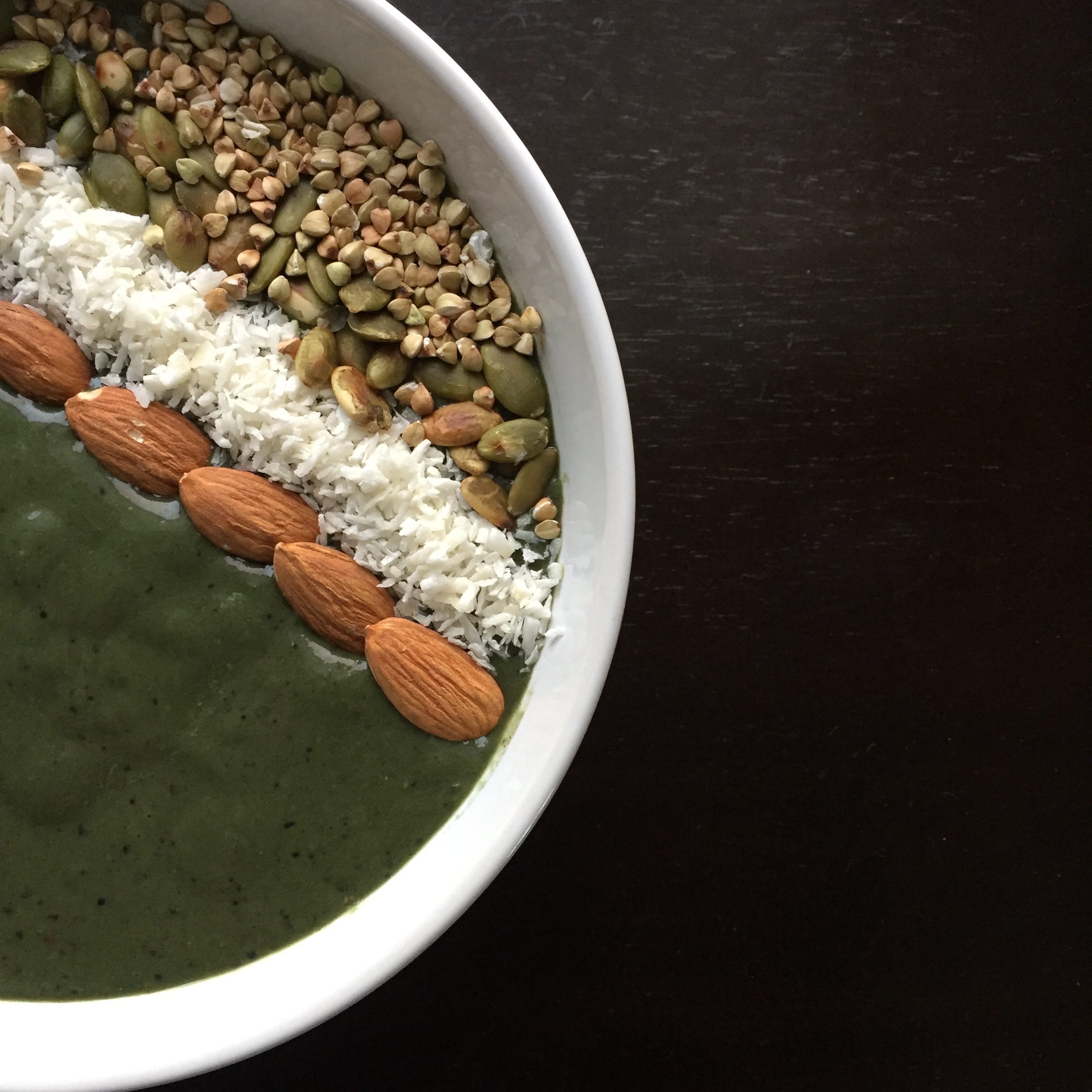Topping a smoothie bowl might be the best part. Some of my favorite toppings are shredded coconut, chia seeds, nuts, toasted pumpkin seeds, and buckwheat groats. I like the way crunchy toppings combine with the creaminess of the smoothie. It adds a really nice texture, and I’m all for foods that incorporate multiple senses.